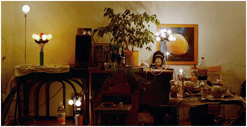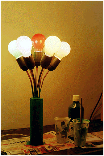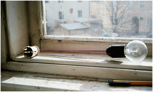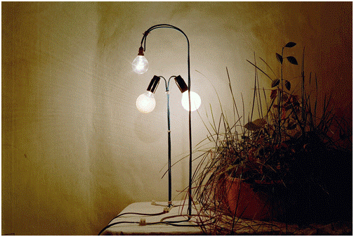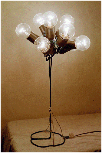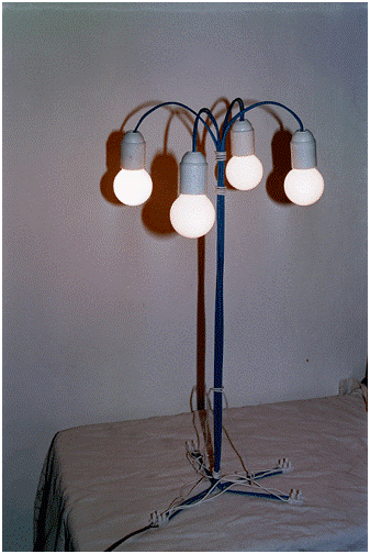 Diese Lampen bestehen aus dickeren Kupferleitungen (ich glaube 3 mm) und Klemmen und Lampenfassungen. Sie entsprechend natürlich nicht dem Sicherheitsstandard. Die Kupferleitungen bekommt man so gerade, wenn man sie ein bisschen „zieht“, das heißt, man hängt sie etwa an einer Türklinke ein und zieht am anderen Ende so fest, bis das Kupfer ein paar Zentimeter nachgibt.