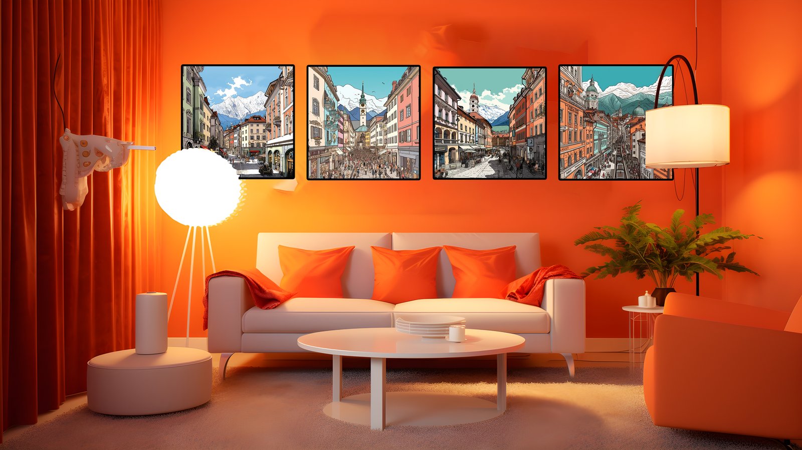 VonKurt HeppkeEin gelber Zug fährt über die Berge. Davor steht eine elektrische Windturbine. Die ganze Szene vermittelt ein warmes Gefühl, ganz im Stil von David Hockney. Der Hintergrund ist schwarz, mit einem minimalistischen Stil, hohem Detailgrad…