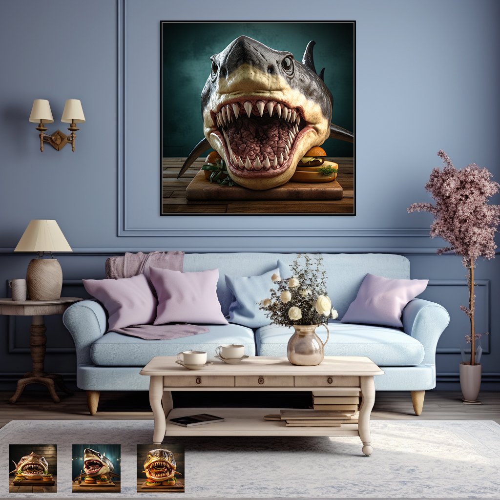 großer Haifischkopf Cheeseburger mit Rindfleisch auf Holzbrett