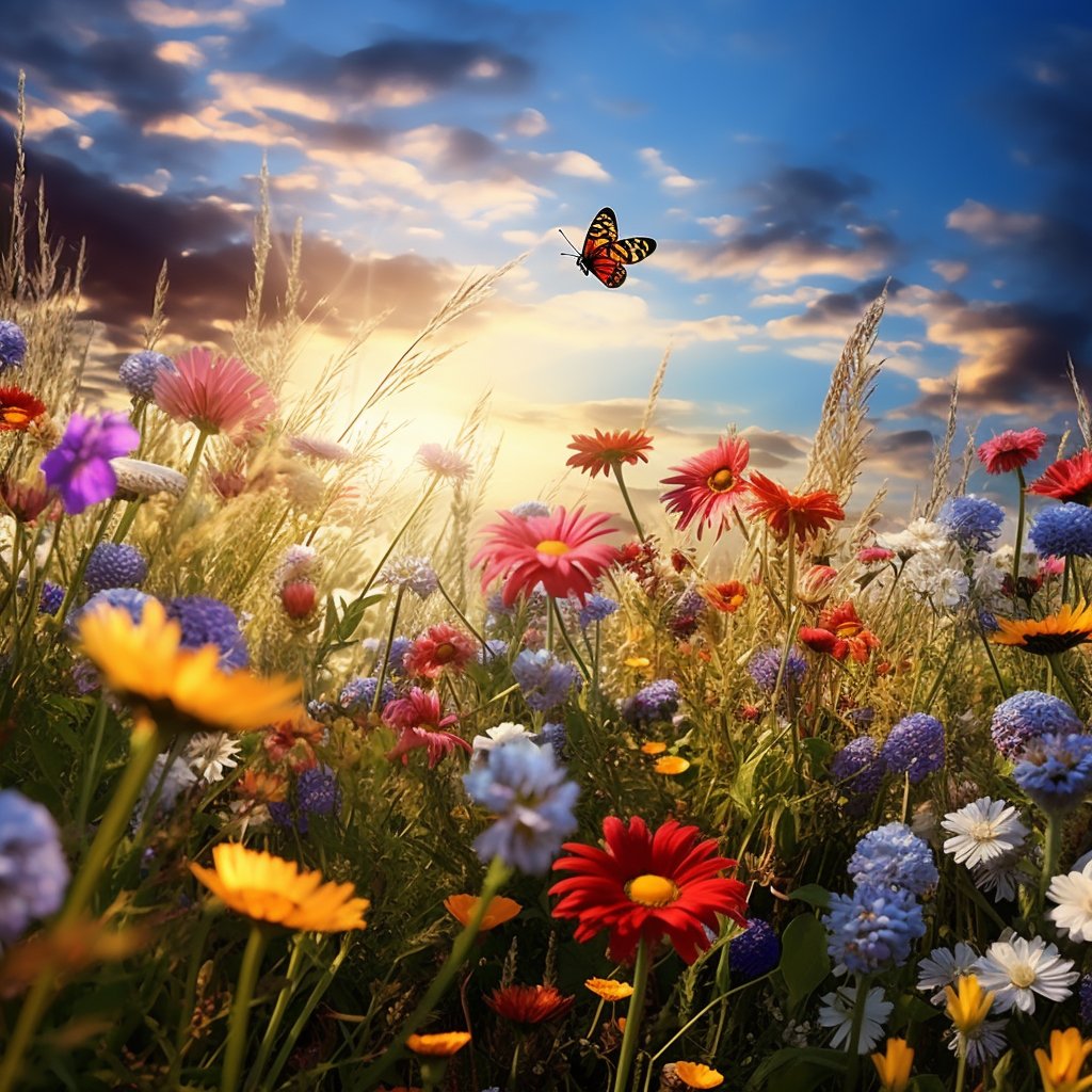 Das Gras ist voll von bunten Blumen, wie rote Rosen, gelbe Sonnenblumen, blaue Hyazinthen und so weiter, die duftenden Duft verstroemen und Bienen und Schmetterlinge zum Fliegen anziehen 4