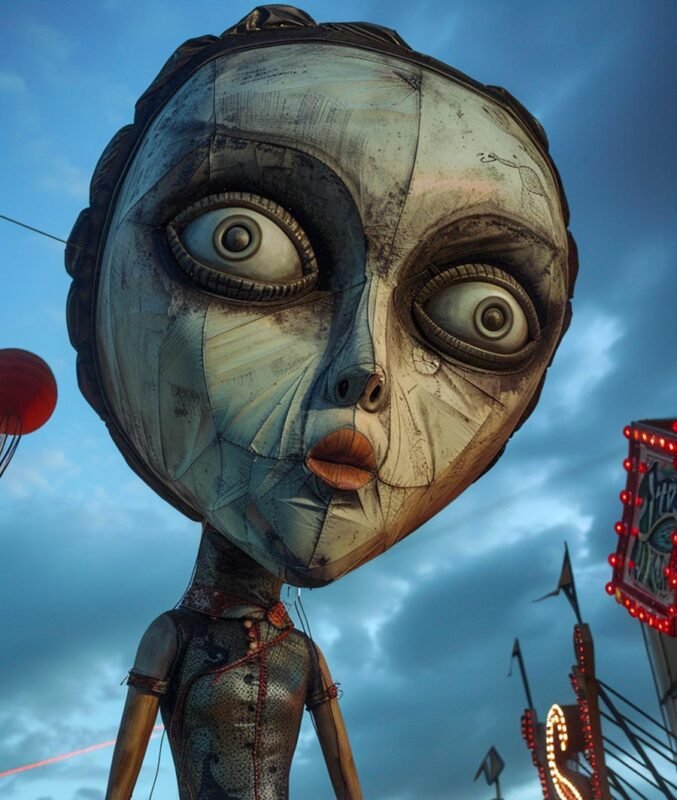 Riesige aufblasbare Puppen, die auf einem Rummelplatz stehen - Sehr geehrte Damen und Herren, ich bin zutiefst geehrt, heute Abend hier zu sein und Ihnen diese außergewöhnliche Ausstellung vorzustellen. Die Bilder, die wir hier sehen, sind nicht nur Kunstwerke,… ...
