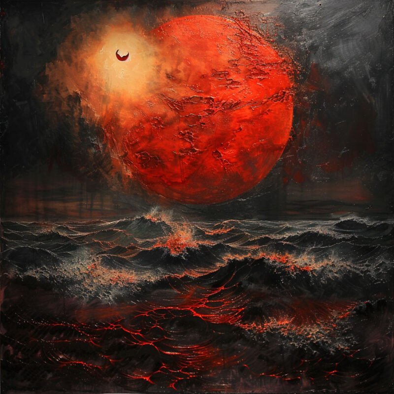Die Sonne als riesige Feuerkugel über dem schäumenden Meer - Das Bild, das ich vor mir sehe, fasziniert mich. Es zeigt eine dunkelrote Sonne, die über einem schäumenden Meer untergeht. Die Farben sind intensiv und kontrastreich, fast wie ein Gemälde.… ...