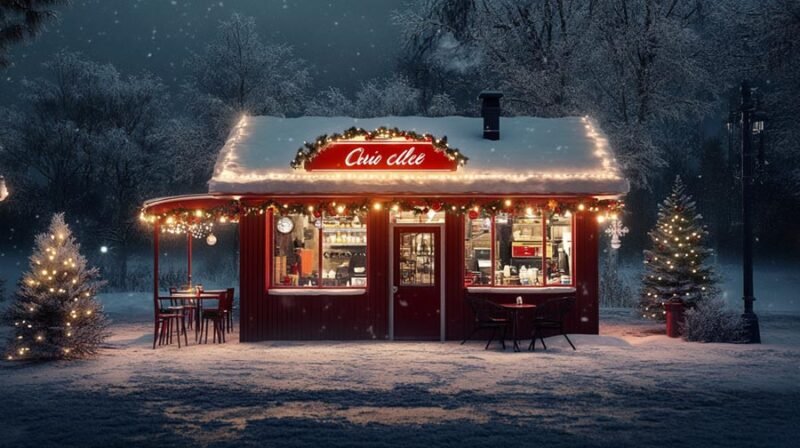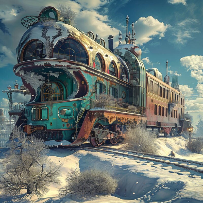 Ein Art-Deco-Zug, der in ein Haus verwandelt wurde, im Schnee - Ein surreales Design eines Art-Deco-Zuges, der in ein Haus verwandelt wurde, im Schnee mit einigen blauen und blaugrünen Elementen, im Stil der Fantasie. In einer verzauberten Winterlandschaft, wo die Grenzen zwischen… ...