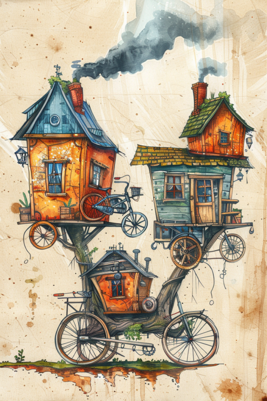 Ein Haus auf Rädern - Ein Haus auf Rädern mit einem Baumhaus im Stil von Tusche und Aquarell, eine skurrile Kinderbuchillustration. Eine Zeichentrickfigur, die auf zwei Fahrrädern in Form von Häusern fährt, von denen eines… ...