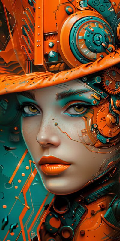 Modernes Frauenportrait mit türkis-oranger Farbpalette - Schönes elegantes und modernes Frauenportrait im Stil von vray tracing, futuristische digitale Kunst, türkis-orange Farbpalette, detaillierte Gesichtszüge, digitale Illustration, surreale Details, leuchtende Farben, retrofuturistische Mode, trägt einen Hut mit Spiralmustern,… ...
