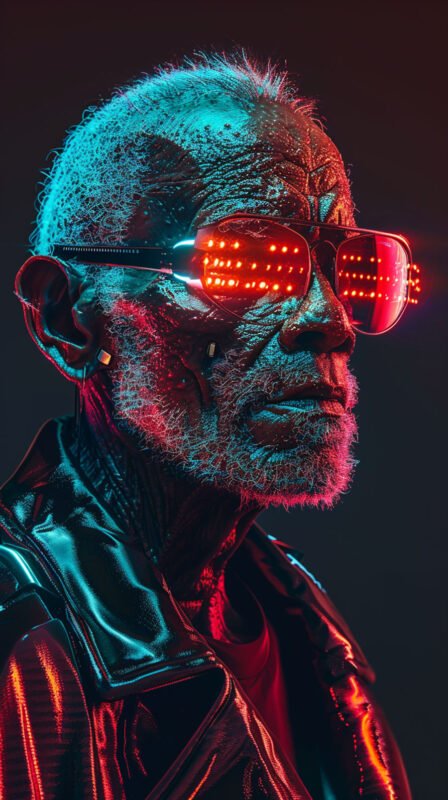 Futuristischer alter Mann mit extrem reflektierenden Brillen - Fotorealistische Halbkörperaufnahme, futuristisch, exotisch, futuristischer alter Mann, Cyberpunk, mit extrem glänzenden bunten Details, extrem reflektierenden Brillen, minimalistisch, extrem glänzenden metallischen Materialien und matten gemischten Materialien. Ein futuristischer alter Mann, halb… ...