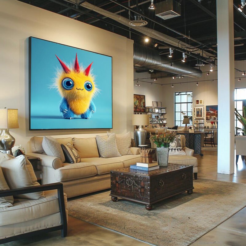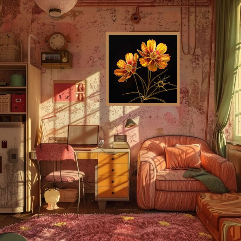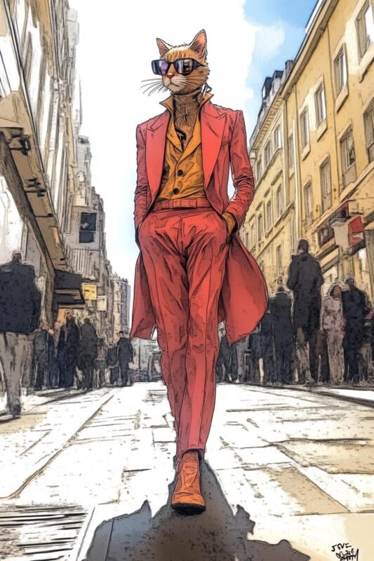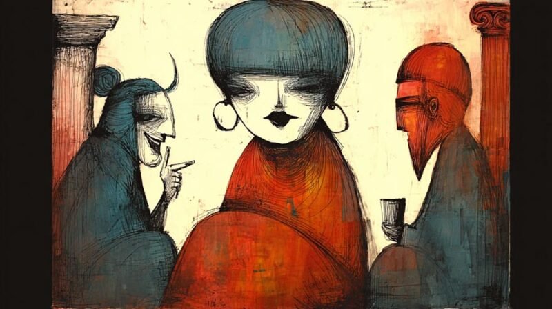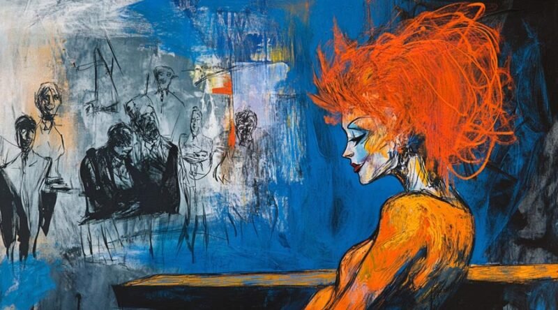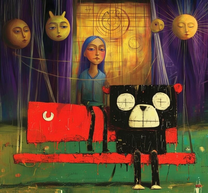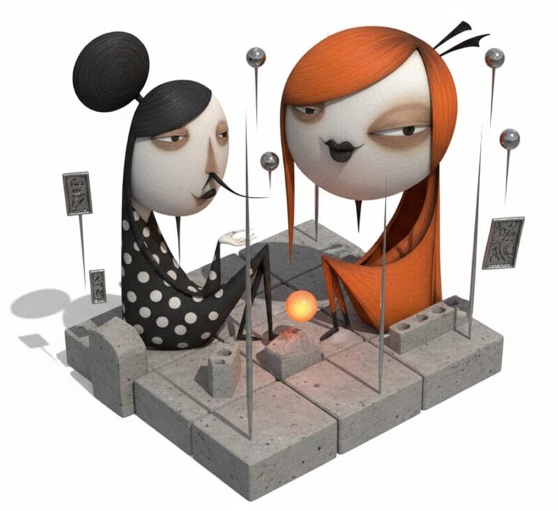 Das ungesagte Wort - Auf einem knallorangen Sofa entfaltet sich eine Szene stiller Anspannung, in der unausgesprochene Worte und vielsagende Blicke die Luft elektrisieren. Was geht wohl in diesen exzentrischen Köpfen vor sich, während… ...