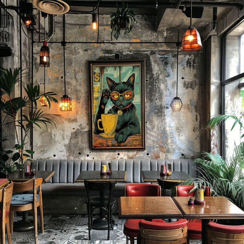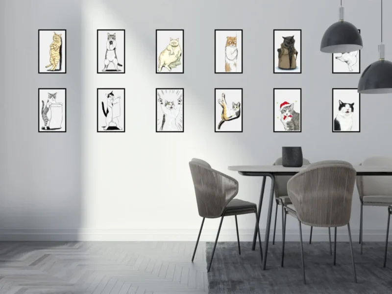 Catwalk an der Wand – Wenn Katzen Kunst machen - Dieses Bild strahlt eine moderne und minimalistische Eleganz aus, kombiniert mit einem Hauch von Verspieltheit durch die Kunstwerke. Die Wandgestaltung mit den Katzenillustrationen ist der zentrale Blickfang des Raumes. Die… ...