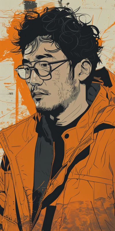 Der asiatische Mann im Cyberpunk-Stil - Asiatischer Mann mit Brille und orangefarbener Jacke, Porträt von vorne, im Cyberpunk-Stil, im Stil von Greg Tocchini, Vektorgrafik mit Tuschepinselstrichen, flache Illustration, hohe Auflösung, symmetrische Komposition, digitale Malerei im Stil… ...