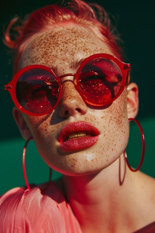 Modell in rotem Samtkleid mit runder Sonnenbrille mit Glitzer - Close up Modell in einem roten Samtkleid, runde Sonnenbrille mit Glitzer und goldenen Details, riesige Ohrringe aus rosa Kunststoff Haare, offener Mund, weiße Haut, dunkelgrüner Hintergrund, rote Lippen, Licht von… ...