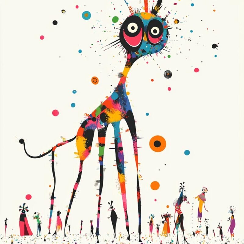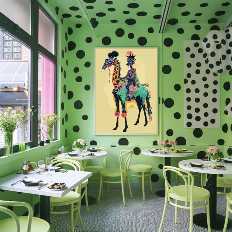 Eine schwarze Giraffe mit schwarzem Haar, die auf einem grünen Pferd reitet - Die schwarze Giraffe mit schwarzem Haar scheint eine ungewöhnliche Reise anzutreten. Ihr langer Hals reckt sich stolz, während sie auf dem grünen Pferd sitzt. Die Sonnenstrahlen, die durch das Blätterdach dringen, verleihen der Szene einen magischen Glanz. Vielleicht ist dies… ...