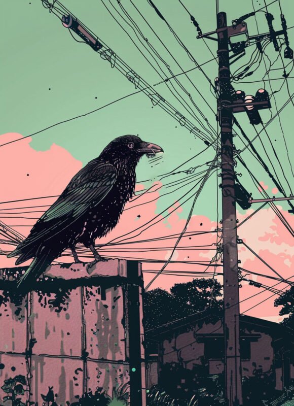 Eine Krähe, die neben einer Hochspannungsleitung an der Wand sitzt - Eine Krähe, die neben einer Hochspannungsleitung an der Wand sitzt, im Stil von Junji Ito. Auf einem verlassenen, düsteren Werksgelände steht eine einsame Krähe auf einem Telefonmast. Ihre schwarzen Federn… ...