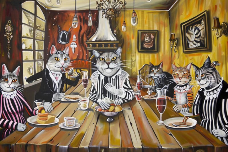 5 Katzen in großen gestreiften Anzügen - Papier-Couché-Kunst, 5 Katzen in übergroßen gestreiften Anzügen, mit menschlichen Figuren, die an einem langen Tisch sitzen, essen und Wein trinken, in einer alten, stilvollen französischen Wohnung mit einer hohen Decke, ...