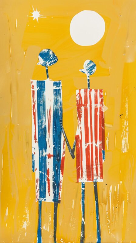 Linienillustration eines dünnen Mannes und einer dünnen Frau - Lithographie einer Linienillustration eines dünnen Mannes und einer Frau, gekleidet in rot-weiß-blau gestreifter Kleidung mit einfachen Linien, gelber Hintergrund, weiße Sonne am Himmel. In einer Lithographie erscheinen ein dünner Mann und eine Frau, beide in rot-weiß-blau… ...