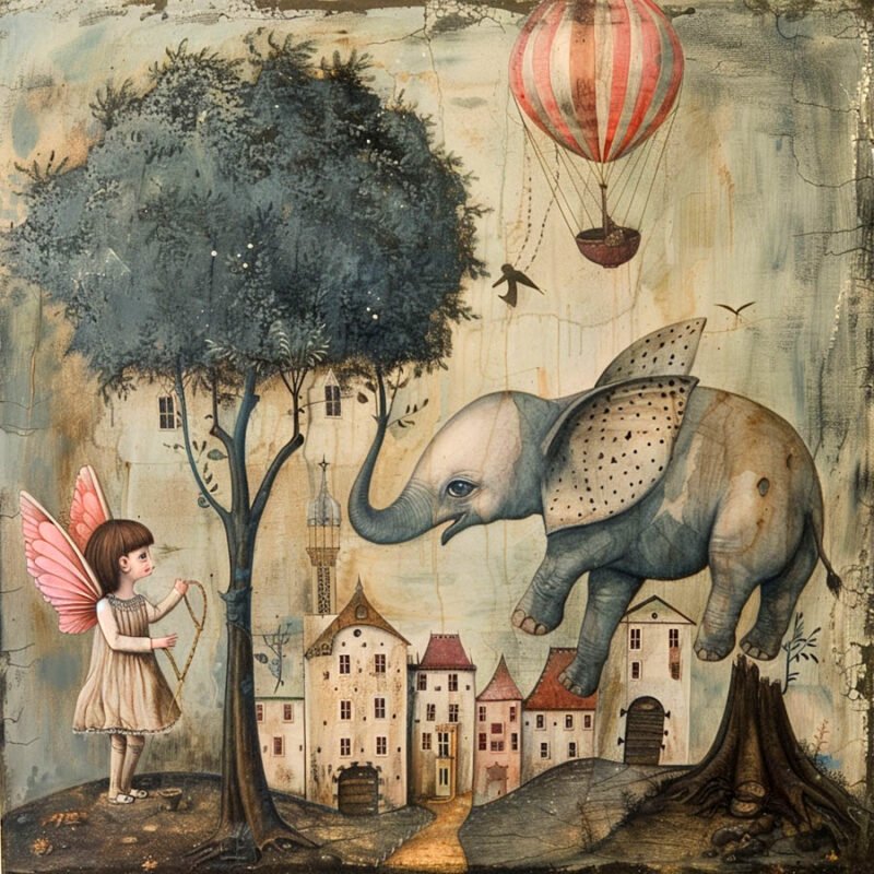 Ein Mädchen und ein Elefant mit Flügeln - Gemälde im Stil des surrealistischen Minimalismus. Ein Mädchen und ein Elefant mit Flügeln versuchen, einen Ballon, eine Stadt, Bäume, einen Zirkus zu erreichen, inspiriert von einem Märchen, leuchtende, blasse Farbpalette ...