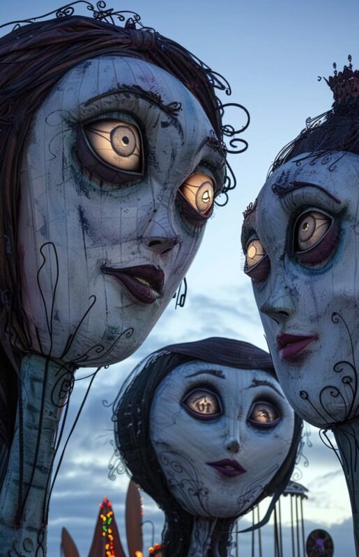 Riesige aufblasbare Puppen, die auf einem Rummelplatz stehen - Sehr geehrte Damen und Herren, ich bin zutiefst geehrt, heute Abend hier zu sein und Ihnen diese außergewöhnliche Ausstellung vorzustellen. Die Bilder, die wir hier sehen, sind nicht nur Kunstwerke,… ...