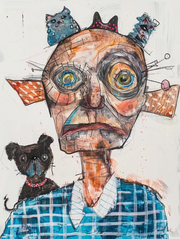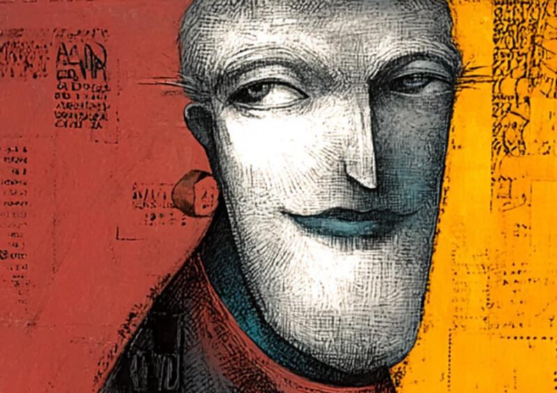 Abstraktes verzerrtes Porträt eines Mannes in Nahaufnahme im Stil von Klee - Meine Damen und Herren, wir stehen hier vor einem faszinierenden Werk, das die Grenzen der Porträtkunst neu definiert. Dieses “Abstrakte verzerrte Porträt eines Mannes in Nahaufnahme” erinnert an die Meisterschaft… ...