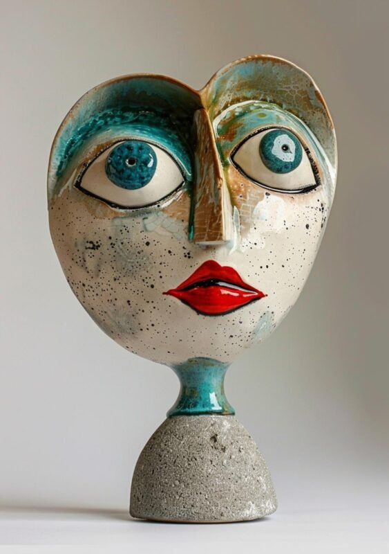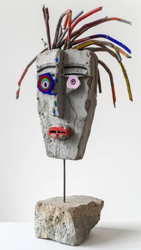 Ein Gesicht aus Beton - Ein Kunstwerk der besonderen Art Stellen Sie sich vor: ein Gesicht aus Beton, mit bunten Haaren und Augen, die Sie ausdrucksstark anstarren. Dieses Kunstwerk auf einem Eisenständer vor weißem Hintergrund… ...