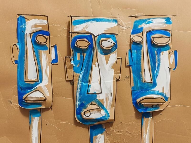 Strichzeichnung - Das Bild zeigt drei hölzerne Totems, die mit blauen und weißen Linien verziert sind. Diese Linien formen einfache Strichzeichnungen von drei Männerköpfen, die auf Papierstäben gemalt wurden. Die Porträts sind… ...