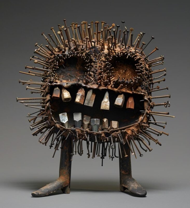 Der Kobold - Eine Skulptur einer anthropomorphen Haarbürste mit Nägeln als Zähnen, bedeckt mit alten Metallstiften und -bolzen Die Skulptur 'Der Kobold' bietet eine bemerkenswerte Plattform zur Untersuchung verschiedener kunsttheoretischer Konzepte und deren… ...