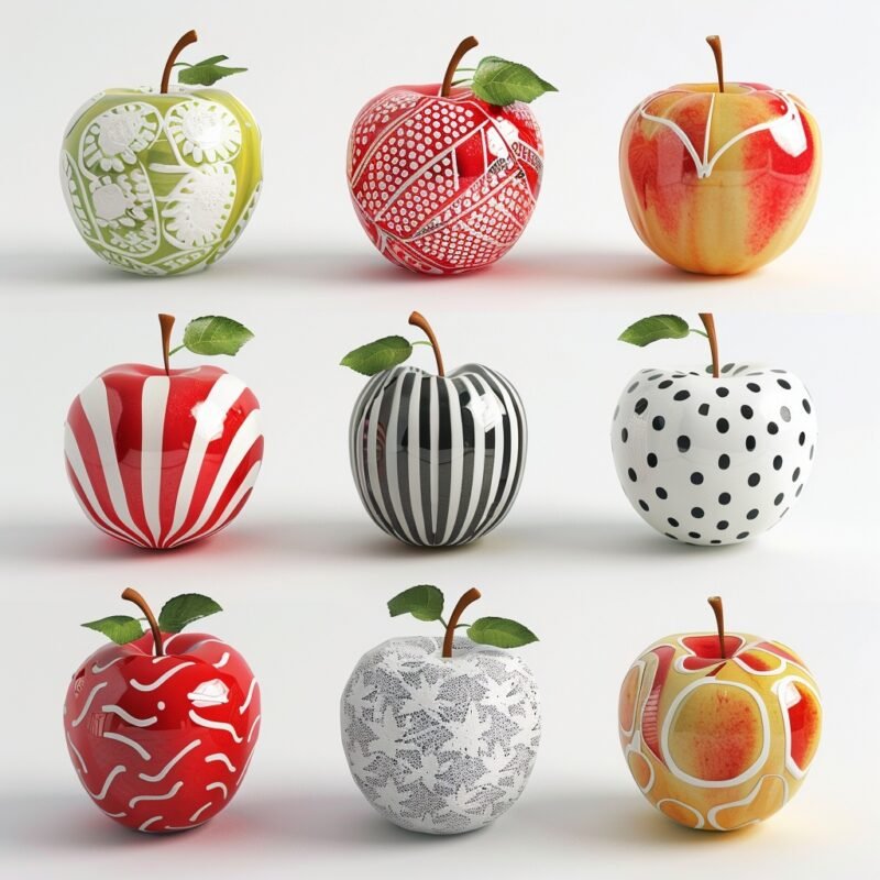 9 Äpfel in einem Raster-Layout - 3D-Modell von Äpfeln mit verschiedenen Designs und Mustern im Stil von Kindern gezeichnet, weißer Hintergrund, 9 Bilder in einem Raster-Layout. 3D model of apples with different designs and patterns drawn… ...