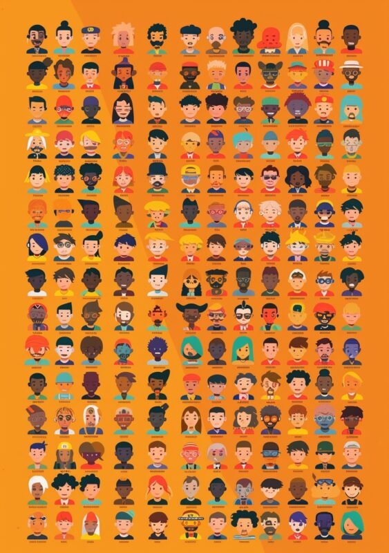 Hunderte von Cartoon-Gesichtern im Stil von Mario-Figuren - ein Raster aus Hunderten von Cartoon-Gesichtern im Stil von Mario-Figuren, jedes Gesicht ist mit verschiedenen Farben und Mustern gefüllt, ordentlich auf einem orangefarbenen Hintergrund angeordnet, lebendig und bunt, cartoonhaftes Design,… ...