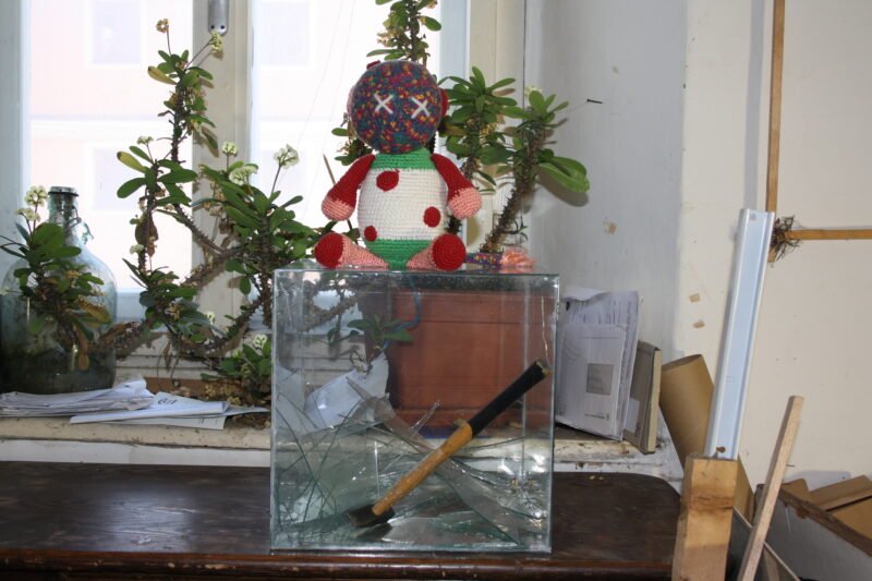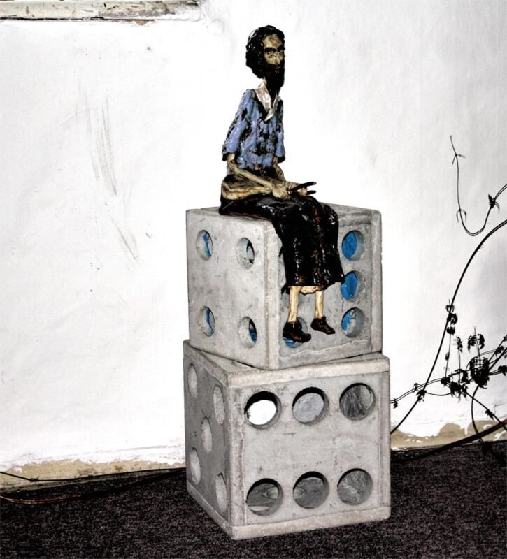 Der Sitz des Ungewissen - Die zwei Würfel hab ich selbst gemacht. Sie sind aus Beton. Bei der letzten Übersiedlung sind sie zu Bruch gegangen. Die Figur die oben drauf sitzt ist aus Ton und… ...