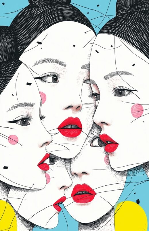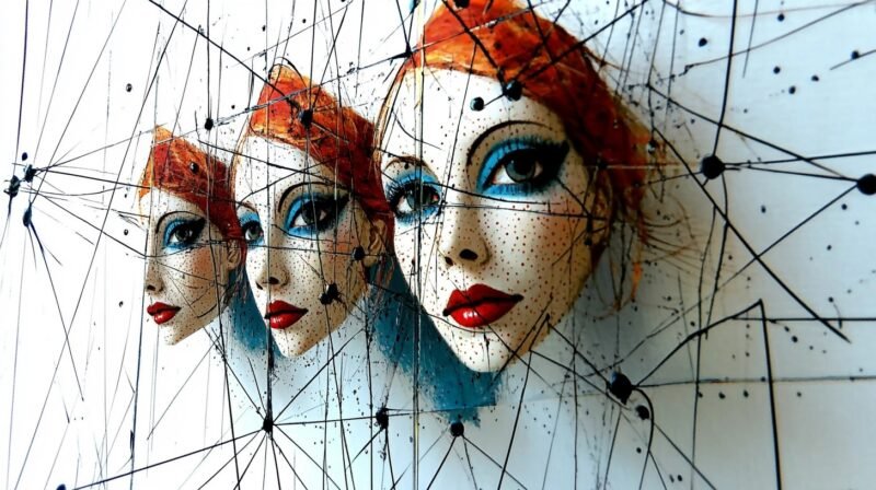 Verheddert im Netz – Ein Selfie für die Kunst - Drei Gesichter, ein Netz und jede Menge Drama. Die Linien und Punkte, die sie wie ein Spinnennetz umgeben, wirken wie eine symbolische Darstellung unserer täglichen „Connections“. Social-Media-Verbindungen, Gruppenchats, „Hey, lange… ...