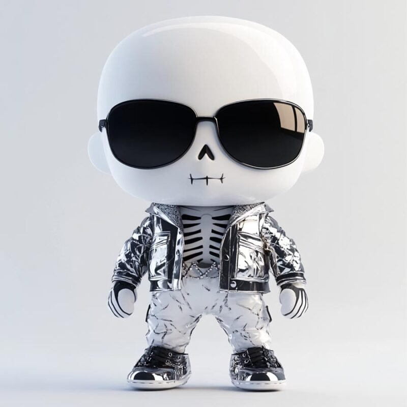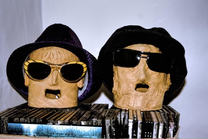 Cool & Skurril - Zwei skurrile Köpfe aus Ton oder Papiermaschee thronen auf einem Stapel alter CDs. Mit ihren übergroßen Sonnenbrillen und Hüten wirken sie wie eine Mischung aus Retro-Stilikonen und surrealen Kunstfiguren. Ihre… ...