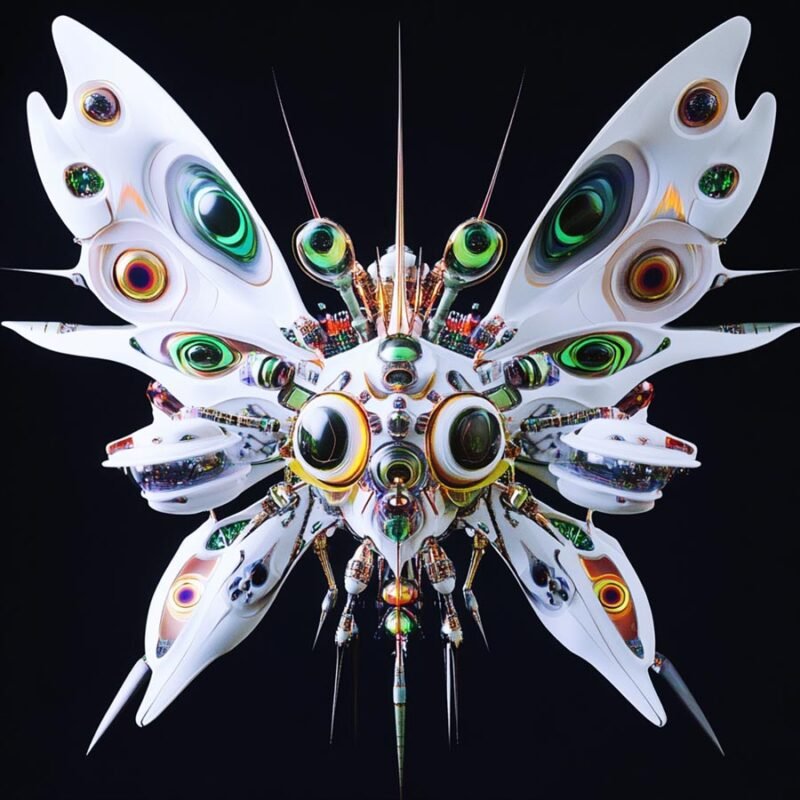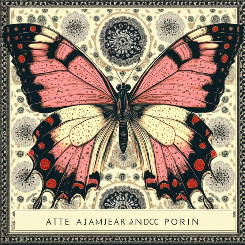 Schmetterling aus Stahl und Seide - Dieses Bild zeigt einen kunstvoll gestalteten Schmetterling im Art-Déco-Stil mit japanischen und mechanischen Einflüssen. Der Schmetterling hat detaillierte, symmetrische Flügel mit einem Farbverlauf aus Rosa, Schwarz und Cremefarben, durchsetzt mit… ...