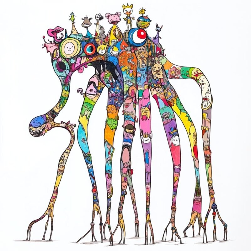 Eilende Figuren - Farbenfrohe, stilisierte Figuren mit überdimensionalen Köpfen schreiten dynamisch durch eine von Insekten belebte Szenerie, ein Kaffeebecher mit der Aufschrift "NOM" verspricht Energie für den Weg. Ein urbaner Marsch voller abstrakter… ...