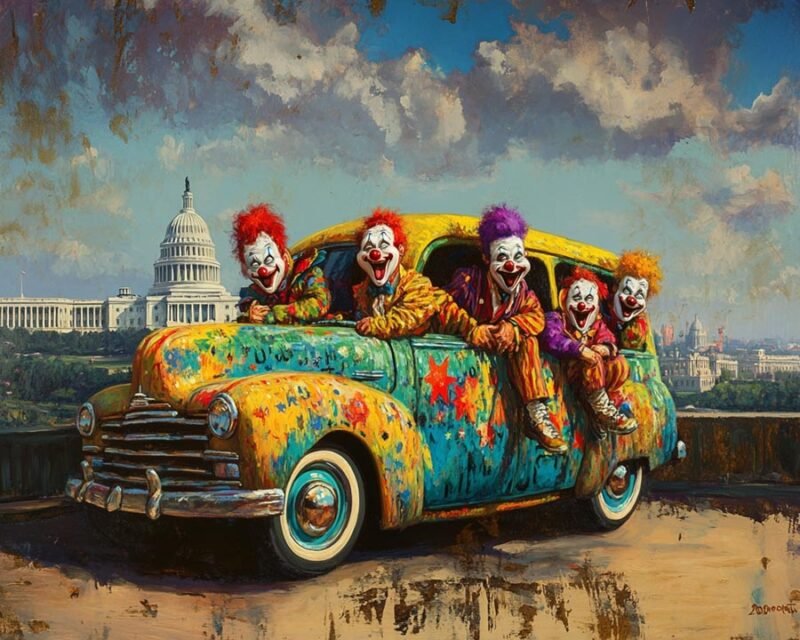 - Eine skurrile Szene mit Clowns in farbenfroher Kleidung, die ein altes Auto fahren, auf dessen Seite das US-Kapitolgebäude gemalt ist, aufgenommen durch ein Weitwinkelobjektiv. Im Hintergrund ist eine detaillierte Zeichnung… ...