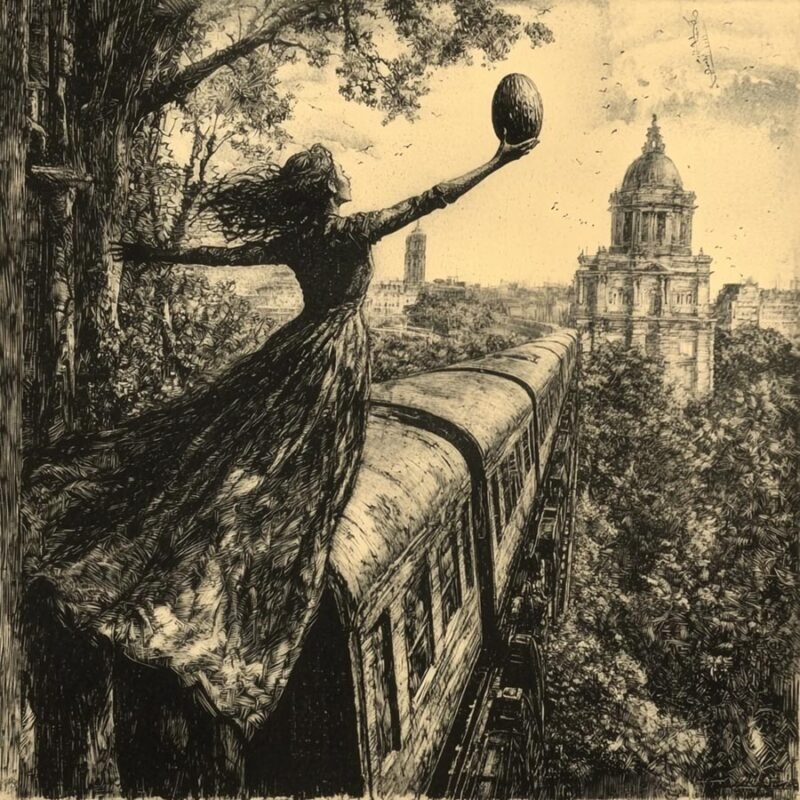 Die Balance - Eine Frau in einem langen, wehenden Kleid, steht auf einem fahrenden Zug . Sie streckt einen Arm aus und hält ein großes Ei in der Hand, als würde sie es… ...