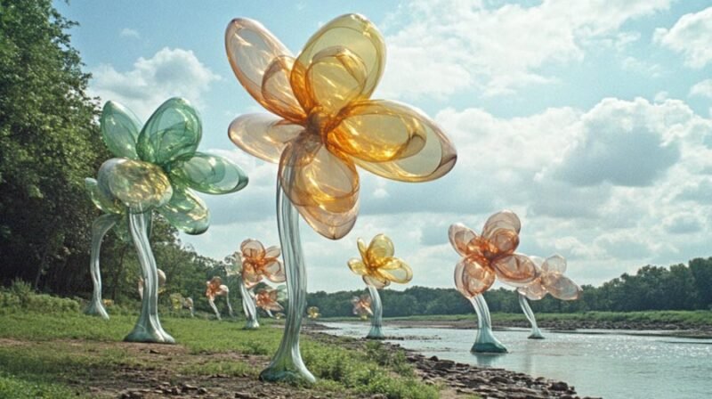 Gläserne Blumen - Riesige, gläsern wirkende Blumen mit geschwungenen, fast organisch-fließenden Stielen, die an einem Flussufer wachsen. Die Transparenz und Reflexionen der Blütenblätter lassen sie fast außerirdisch erscheinen, als wären sie aus einer… ...