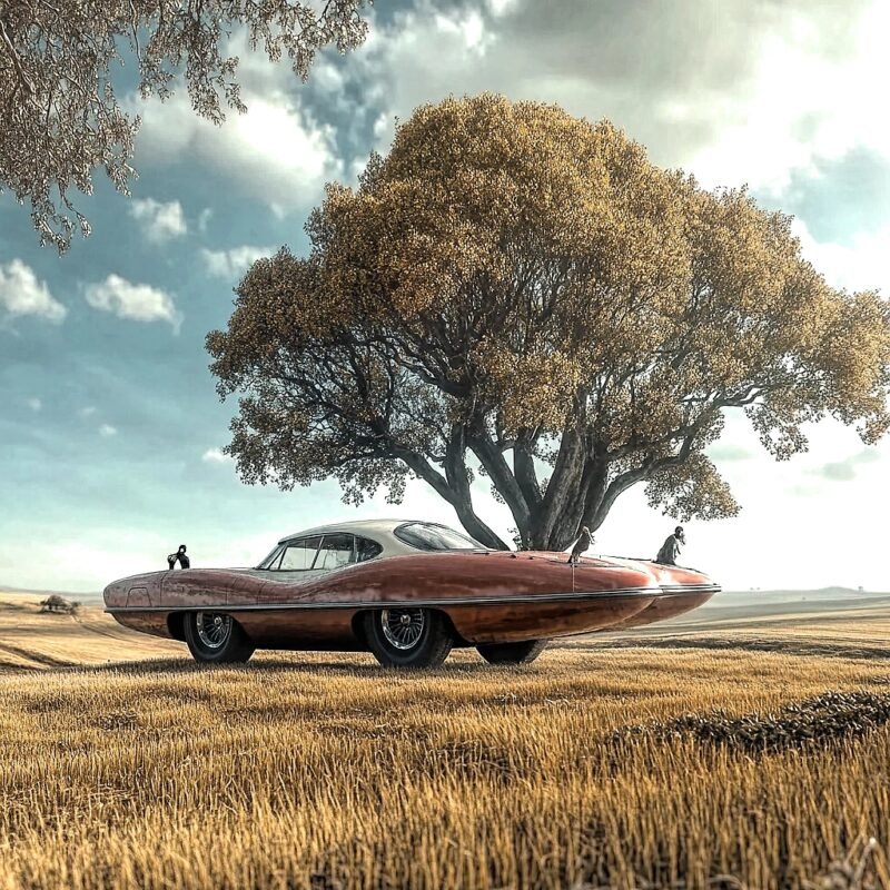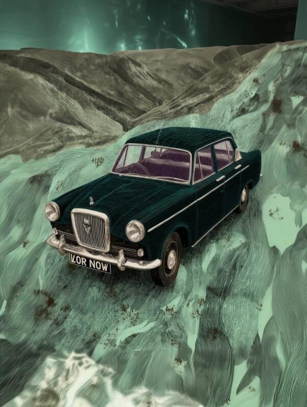 Auf den Spuren der Zeit - Ein klassischer, dunkler Wagen steht als Fixpunkt in einer Landschaft, die sich wie flüssiges Gestein oder gefrorene Wellen vor ihm auftürmt. Der Himmel darüber ist von einem unheimlichen Grün durchzogen,… ...