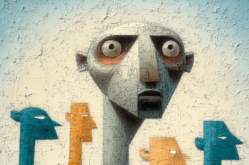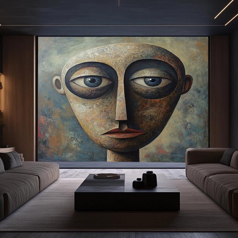Die Beobachter - Ein eindringlicher Blick, der aus der Masse heraussticht – dieses Kunstwerk erforscht in groben Texturen und kubistischen Formen das Gefühl des Andersseins und der stillen Beobachtung. ...