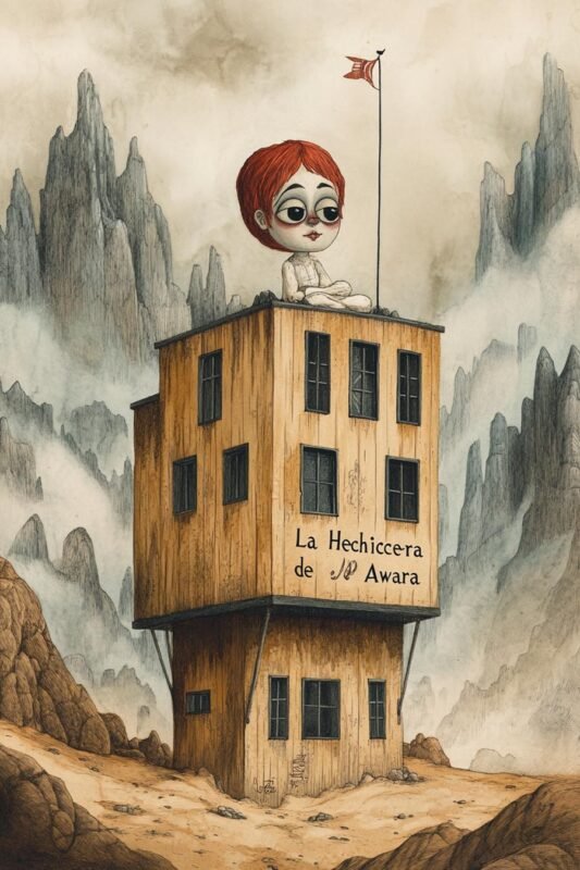 Die Hexe von Awara: Ein stilles Warten - Das Bild zeigt ein hohes, schmales Holzgebäude mit mehreren Fenstern, das in einer felsigen, bergigen Landschaft mit nebligen Gipfeln im Hintergrund steht. Auf dem Dach des Gebäudes sitzt eine große… ...