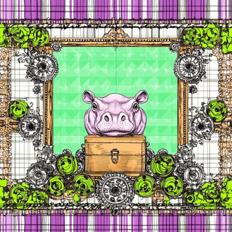 Mechanisches Nilpferd – eine Balance der Elemente - Hier sehen Sie ein buntes und detailreiches digitales Kunstwerk, das eine Vielzahl von Elementen kombiniert. Im Zentrum des Bildes befindet sich ein rosa Nilpferd, das auf einer Art Thron oder… ...