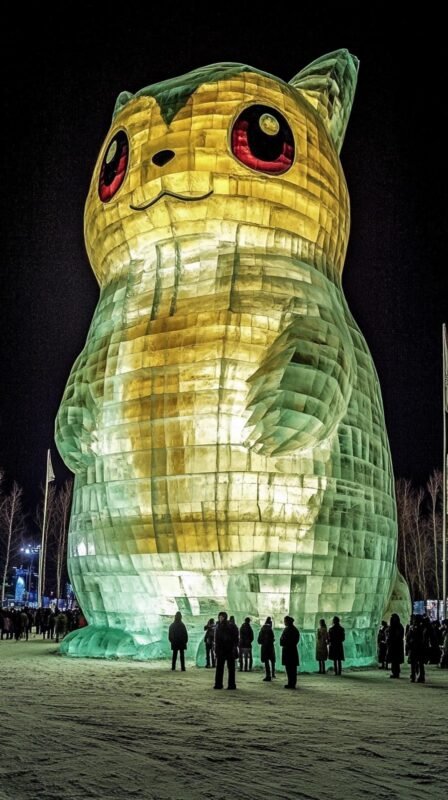 Die strahlende Katze - Eine beeindruckende Eisskulptur in Form einer Katze mit großen, leuchtenden Augen. Die Skulptur ist aus vielen rechteckigen Eisblöcken zusammengesetzt und wird von innen beleuchtet, was ihr ein beeindruckendes Aussehen verleiht.… ...