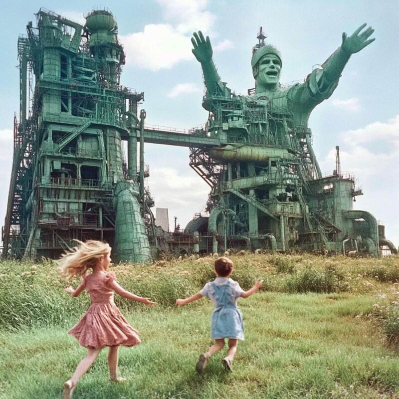 Der vergessene Titan - Das Bild zeigt eine surreale Landschaft mit zwei Kindern in altmodischer Kleidung, die über eine grüne Wiese auf eine gigantische, industriell anmutende Struktur zulaufen. Diese Struktur besteht aus verfallenen, rostig-grünlichen… ...