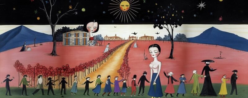 Party mit einer Rotweinflasche - Im Stil von Christophe Tékésa eine Illustration mit einer riesigen Rotweinflasche in der Mitte, wie eine Party mit einer Miniatur, lebendige Atmosphäre, sehr detailliert und realistisch. Ein Mann hält ein… ...
