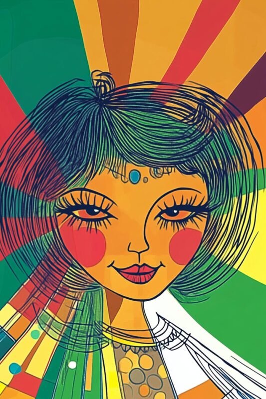 Wenn Farben flüstern - Ein farbenfrohes Porträt im Retro-Stil, das ein lächelndes Frauengesicht mit großen Augen, auffälligem Haar und einem Punkt auf der Stirn zeigt. Der Hintergrund explodiert in bunten Strahlen, was dem Ganzen… ...
