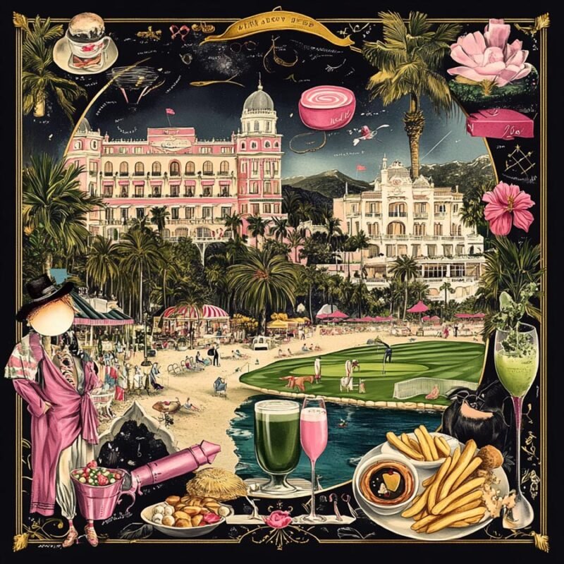 Riviera Rhapsodie - Die Côte d'Azur – kein Ort, eher ein Gefühl, ein Kaleidoskop aus gleißender Sonne, azurblauem Meer und opulenten Versprechungen. Das legendäre rosa Hotel thront wie ein Zuckerbäckertraum über der Bucht (Bild… ...