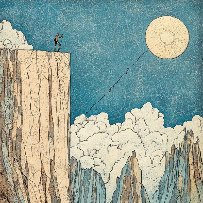Ein Echo in der Weite - Im Stil einer alten Radierung oder eines Holzschnitts steht eine kleine Figur mit einem Stock auf einer hohen, zerklüfteten Klippe. Eine lange, dünne Leine oder ein Seil scheint die Figur… ...