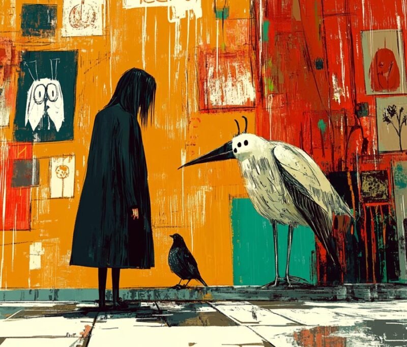 Die Raben der Stadt - Im Mittelpunkt steht immer eine menschliche Figur, oft ein Mädchen in dunkler Kleidung, und ein oder mehrere Vögel – meist groß, schwarz und rabenartig. Das Ganze spielt sich vor Wänden… ...