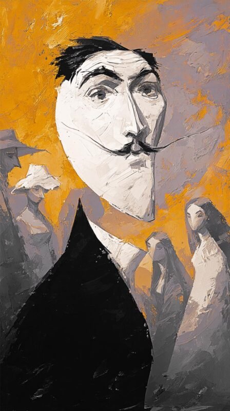 Monsieur Papillons Abend der Beobachtungen - Der Saal summt wie ein Bienenstock aus Seide und gedämpftem Lachen. Monsieur Papillon steht leicht abseits, eine dunkle Silhouette vor der terrakottafarbenen Wandtäfelung, sein Haar scheint vom unsichtbaren Wind einer… ...