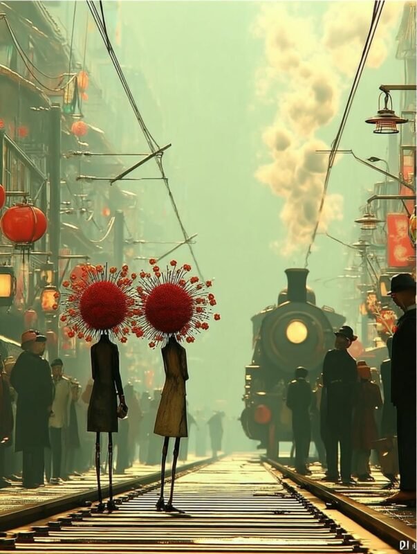 Pom und Pias Reise auf den glühenden Schienen - Der große Bahnhof summt wie ein Bienenstock aus Stahl und Stimmen. Dampf zischt von der alten Lokomotive, die wie ein geduldiges Tier auf den Gleisen wartet, und das Licht unzähliger… ...