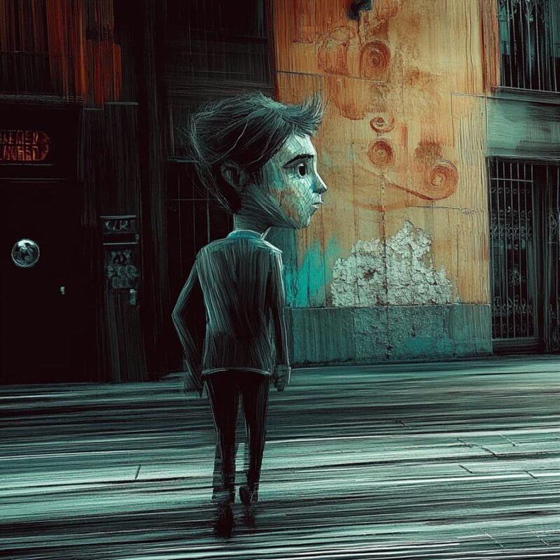 Finns Weg durch das Flüstern der Stadt - Finn geht durch die Gassen einer Stadt, die ihre besten Tage hinter sich hat. Die Wände sind verwittert, die Farben verblasst. Jeder Schritt hallt leise auf dem von Linien durchzogenen… ...