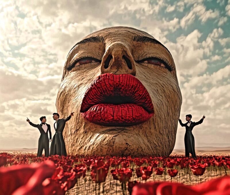 Die schlafende Göttin der Wüste - Im Zentrum dieser surrealen Szene ruht ein monumentaler Kopf, geformt aus Stein oder verwittertem Holz, dessen Textur die Geschichte von Äonen zu erzählen scheint. Die Augen sind geschlossen, versunken in… ...
