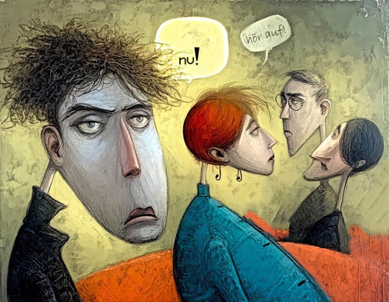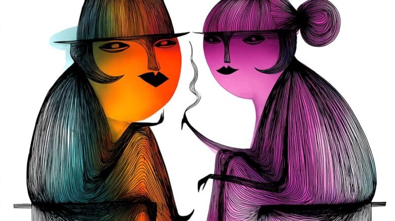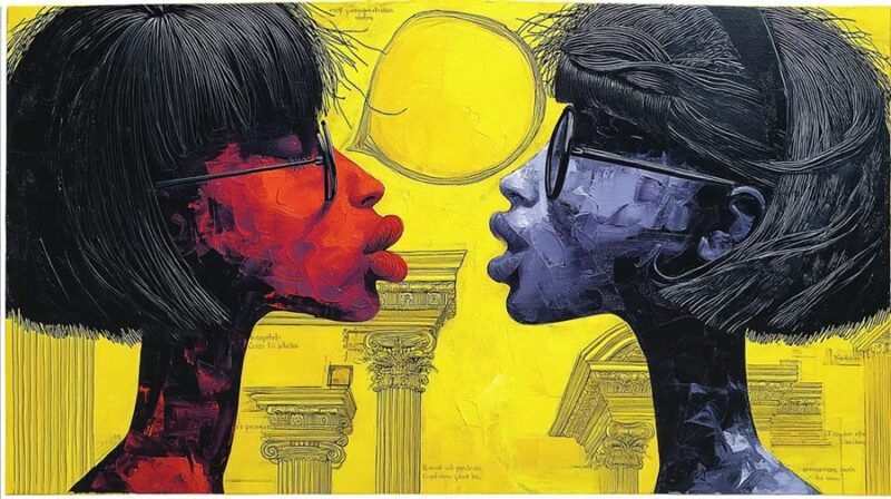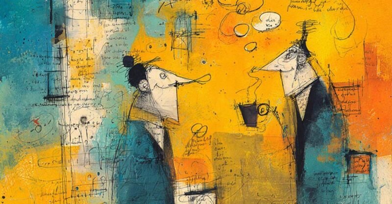Sprechen, Zuhören und die Kunst der Verbindung - Wenn wir diese Bilder betrachten, werden wir sofort von einer lebendigen Farbpalette und einer kraftvollen Komposition gefesselt. Im ersten Bild sehen wir zwei stilisierte Köpfe, die sich gegenüberstehen. Eine Figur… ...